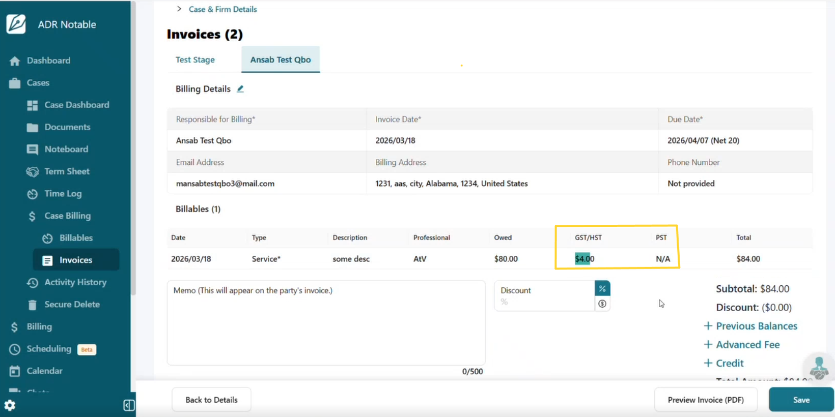 This article explains how ADR Notable allows you to track Provincial Sales Tax (PST), as well as Goods and Services (GST) and Harmonized Sales Tax (HST)