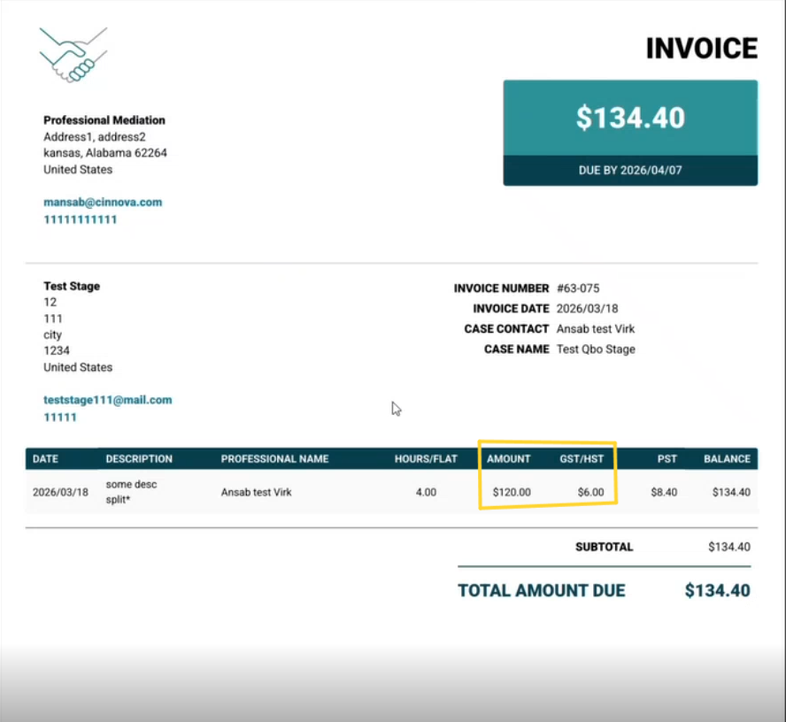 Lastly, in QBO you will see the GST/HST and PST taxes calculated: